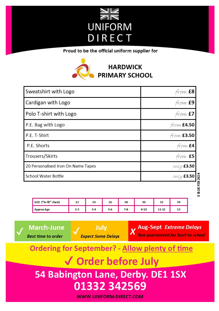 Branded School uniform can be purchased from Uniform Direct, 54 Babington Lane, Derby, DE1 1SX Tel: 01332 342569 or online at https://myclothing.com/ueslink/6171.school?t=1587031872018